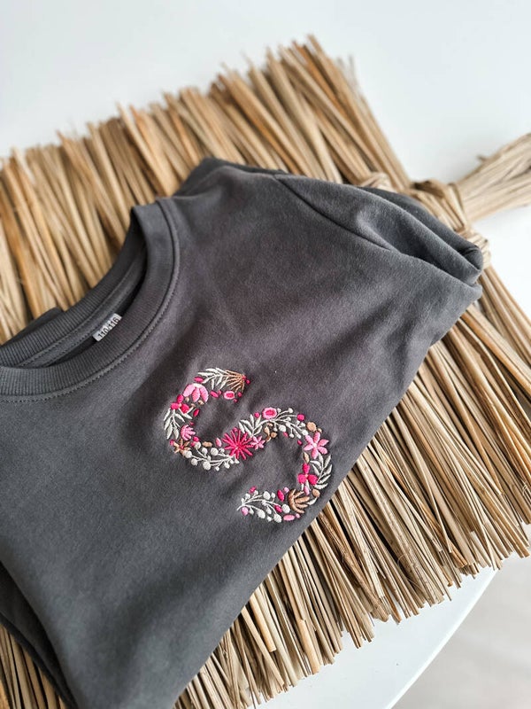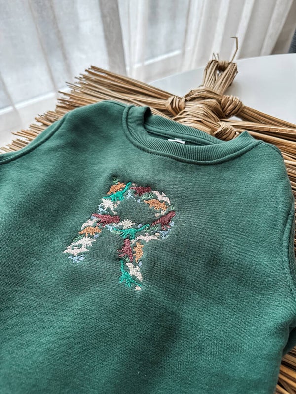 EIGEN sweater met bloemletter / Dino letter/ open letter